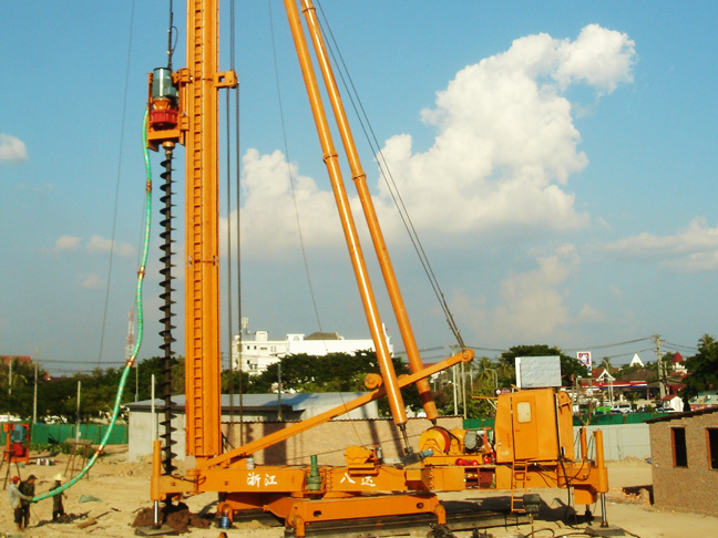 ZJB系列步履式長(zhǎng)螺旋鉆孔機(jī)由液壓步履式多功能樁架和鉆進(jìn)系統(tǒng)兩個(gè)部分組成。樁架采用液壓步履式行走機(jī)構(gòu),自動(dòng)化程度高、可進(jìn)行正反180度回轉(zhuǎn),底部設(shè)有四條液壓支腿油缸及兩條行走油缸以輔助行走及回轉(zhuǎn),同時(shí)增加施工時(shí)的整機(jī)穩(wěn)定性。鉆進(jìn)系統(tǒng)包括動(dòng)力頭與鉆具,動(dòng)力頭的輸出軸與螺旋鉆具為中空式,打樁機(jī)采用長(zhǎng)螺旋成孔,可通過鉆桿中心管將混凝土或泥漿進(jìn)行泵送混凝土CFG樁施工,即能鉆孔成樁一機(jī)一次完成。使用該機(jī)進(jìn)行鉆孔灌注樁作業(yè)時(shí),沉孔效率高、沉樁質(zhì)量好,對(duì)于穿透沙礫層效果遠(yuǎn)大于錘擊沉樁法,同時(shí)還有效避免了錘擊及振動(dòng)沉樁對(duì)地基擠壓而危及臨近建筑物的不良影響。